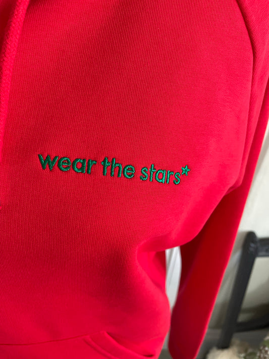 Meet Our Bright Red Hoodie with Forest Green Wear the Stars logo